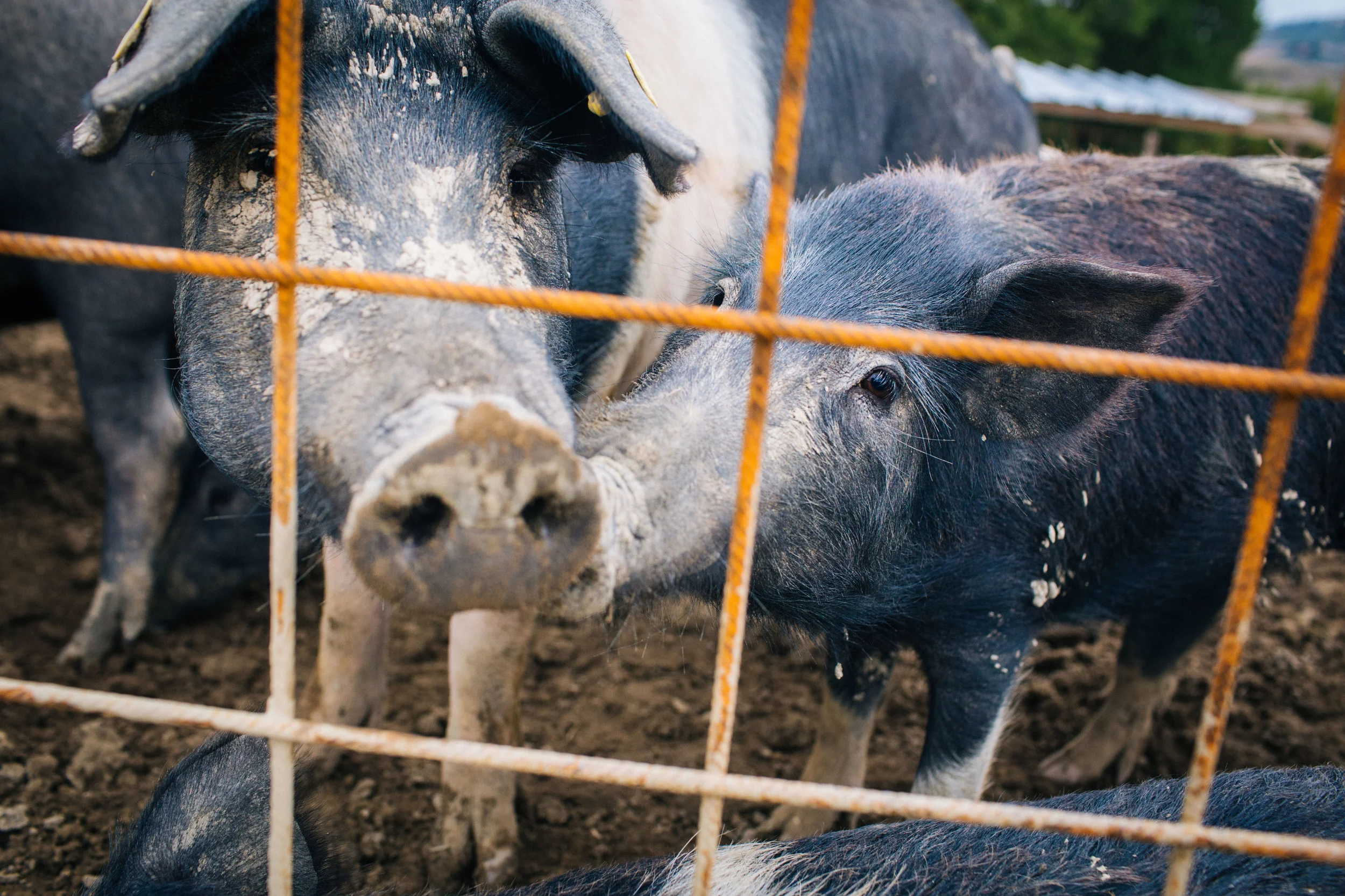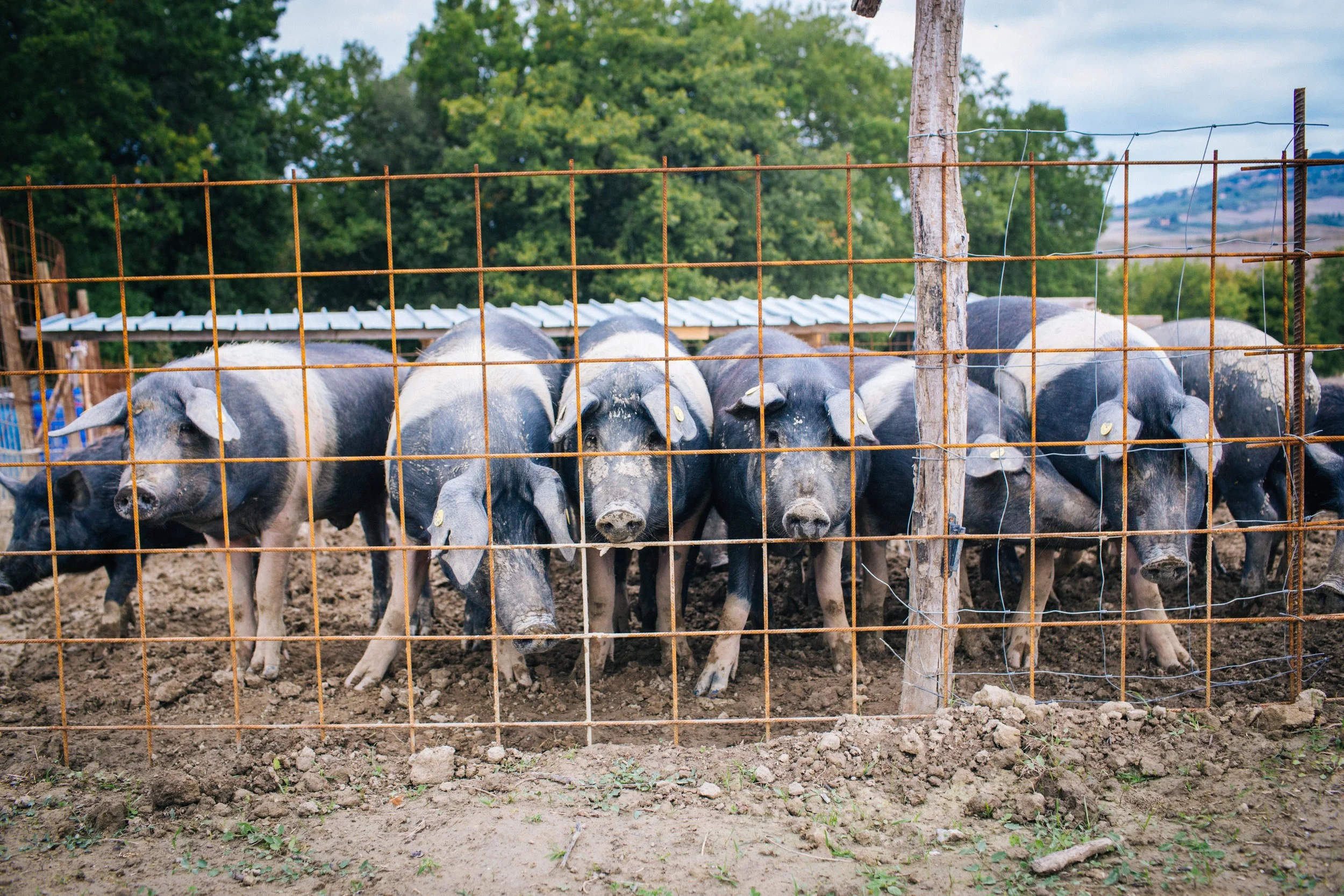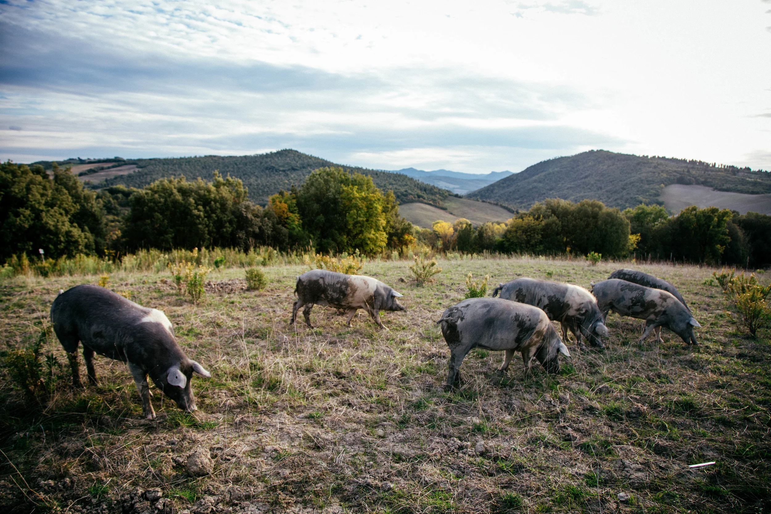 Asia escorts me to the oldest pigs first, where she is only brave enough to bite their ears when there is a fence separating her from a 300-pound pig, hungry and large enough to crush her if it wanted to. The pigs are the breed Cinta Senese, and have been a part of this Tuscan landscape since the year 1300 (you can see Cinta Senese in royal paintings of that time). Their existence nearly evaporated in later years before the Tuscan government reintroduced them and encouraged farmers to raise them again in the 1970s. Now they're celebrated as the regional pig of Tuscany, famous for the way their meat is naturally marbled with fat, its texture and flavor unique and delicious. The oldest Cinta Senese, who are next in line to be slaughtered for salumi in November, can smell the approach of their feeder (me), and will run as a herd to the gate to greet me, climbing over each other to get in. We put food in their pen the night before, so as to make the morning process more swift, as the ears can only take so much of their eardrum-bursting squeals of hunger in the morning. I ensure you though, these pigs are well fed. The farm follows the rules of the DOP, Denominazione di Origine Protetta, which says that Cinta Senese farmers must feed their pigs a combination of what they produce (in this case we feed them our ancient cereals, which we also use to make our own pasta and flour) and whatever the pigs find naturally in the forest and on the land. Cinta Senese farmers are only allowed to feed them once per day--then they must forage on their own for the rest of the day. But pigs will always eat if they smell food, and nothing tickles their nose quite like the grain I feed them each day. When I open the gate, it's important to stand clear of the way, as hundreds of pounds of might and hunger rush by me. Then, a negotiation ensues as each pig looks at their helping, wanders around to make sure no one else has more than they do, and finally settles to eat.