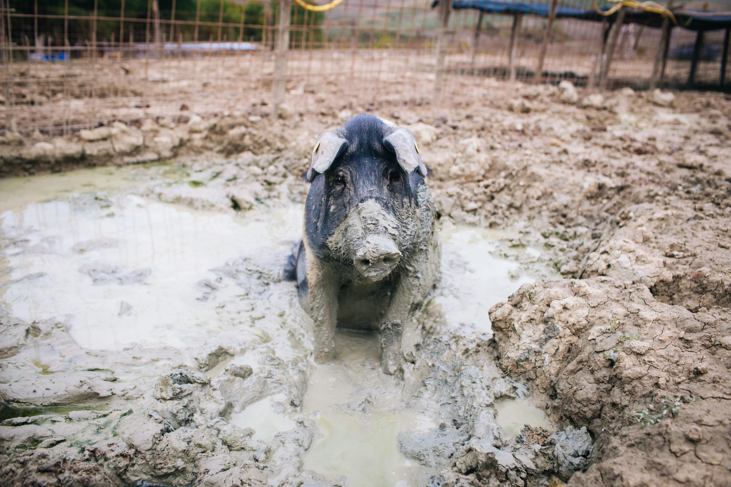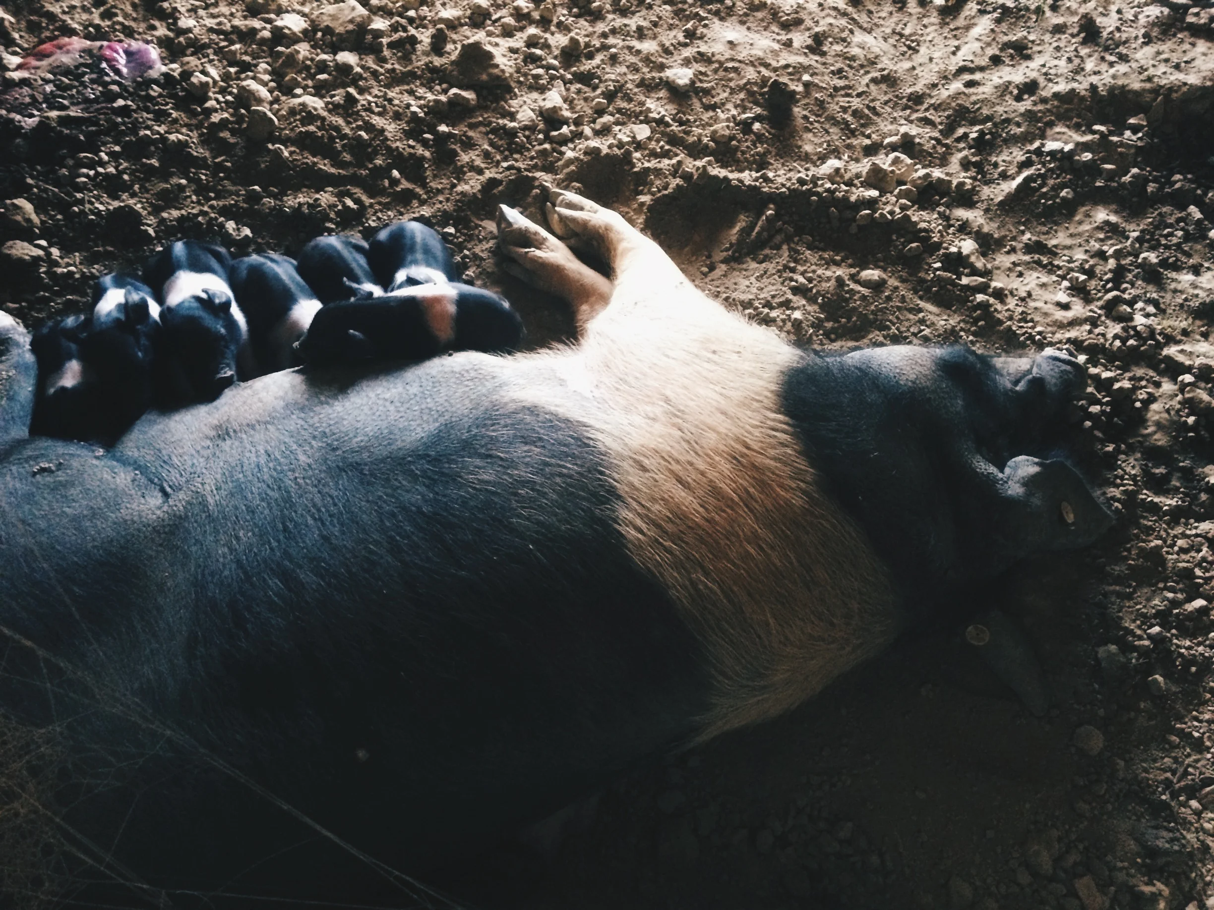 With the greediest animals out of the way, my morning calms down. I visit the two pregnant Cinta Senese, who now reside in their own luxury suites--almost an acre for each to walk, eat, and sleep comfortably without the pressure of the other pigs. They each have their own little house to sleep inside when it rains, and a private mud hole to rest in. I found one of the mothers, due any hour now, calmly laying in her mud hole as if she were in a multi-jet Jacuzzi. Her eyes were half closed, her breathing a little shorter, but content nonetheless. ***