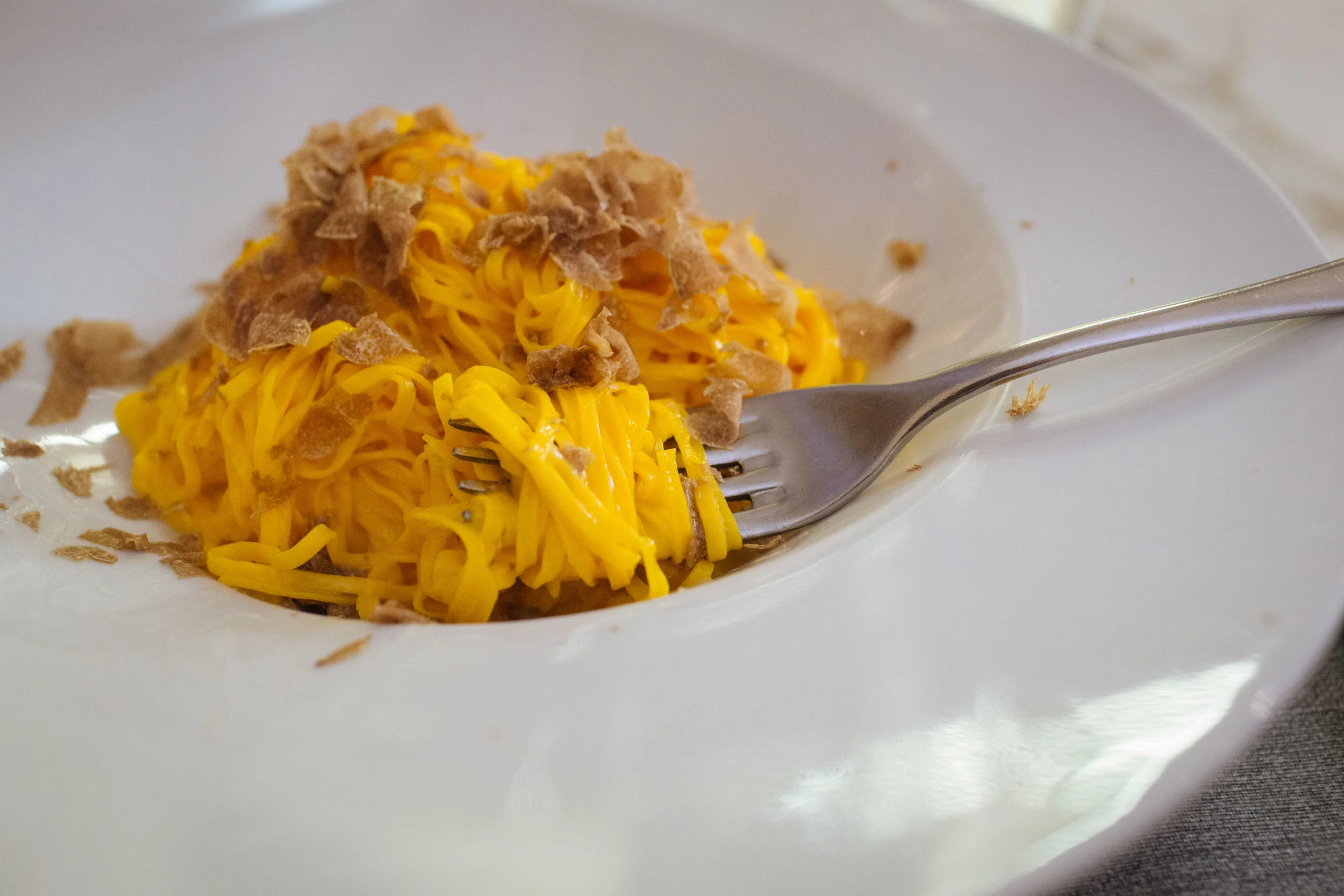 Despite the truffles, I wandered through the festival tasting moscato from Asti, castelmagno, blu, and robiola cheeses, sausages, bagna cauda, andtorta di nocciole (a Piemontese hazelnut cake). As I walked by, one of the truffle farmers handed me his prized 350-euro truffle. I had never held food worth that much, and while I was tempted to buy its smaller less expensive cousin, I was advised by a friend not to buy truffles at the festival or at this time. Air and moisture deplete a truffle's taste and fragrance rapidly, and the ones at the festival sit out all day long. Even more alluring is the selection of truffle oils and salamis, but often these are used with synthetic truffle. Supposedly, everything sold within the festival's walls is certified as using real truffle, but given how real truffle spoils quickly, I personally refrained from buying anything with truffle in it to take home. Rather, I was advised, enjoy the truffle freshly shaved over the tajarin or tartare at one of the restaurants in town. So that's exactly what I did.