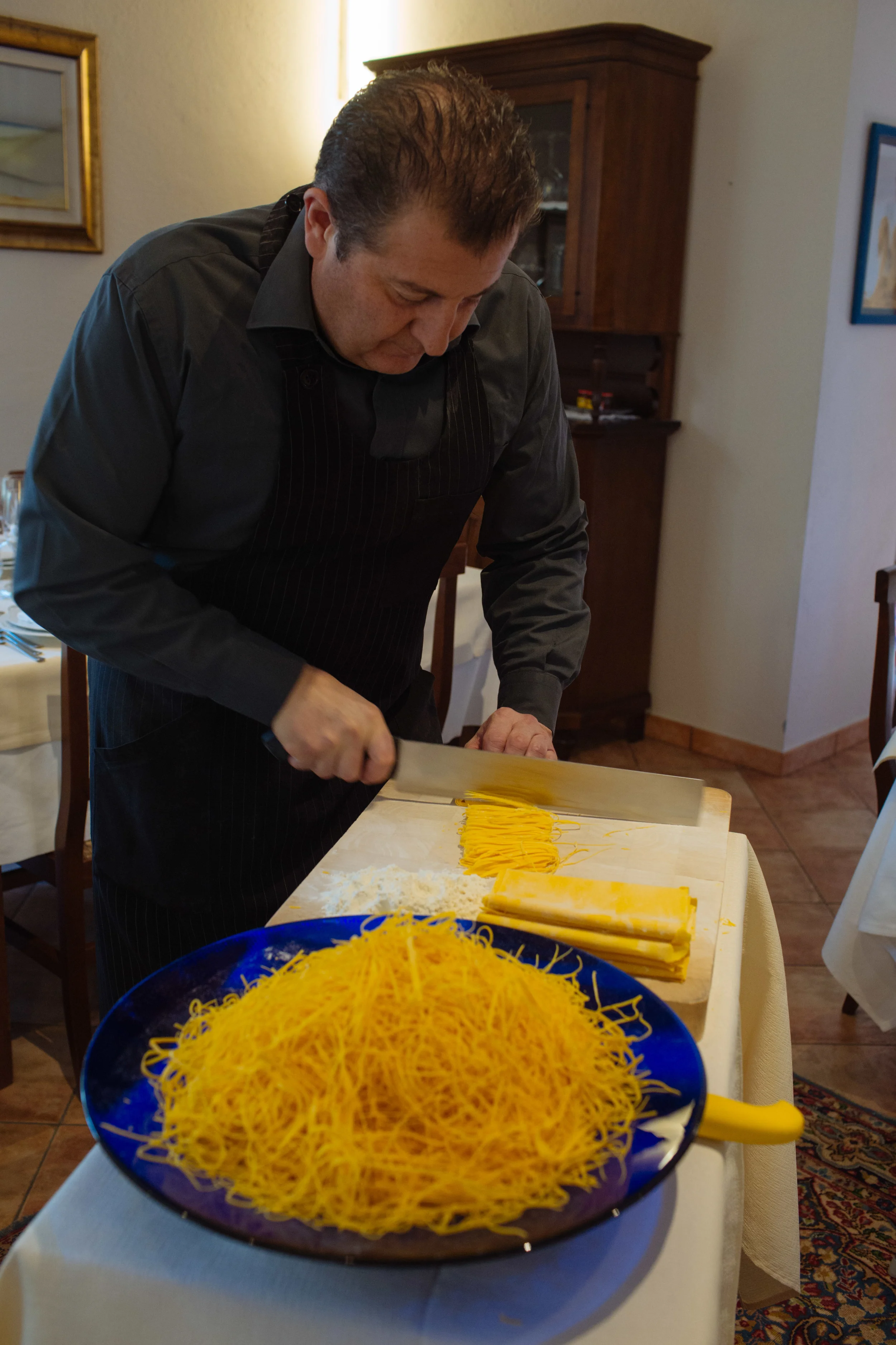 A certified Slow Food restaurant, Osteria da Gemma gets its name by its creator and chef, Gemma. An older woman with white hair and a sweet smile, she makes appearances on the floor of her restaurant in her nondescript white apron, house slippers, and basic black knee-length skirt and cotton tshirt. The restaurant originally began as a circulo, which is like a casual dining club for farmers. The circulos became popular in this region in the 1980s, just as Slow Food was starting to build itself as an organization. The "members" club, just 10 euros to enter, were made up of local farmers who supported each other by eating communally and locally. She would make meals in her living room with friends and family, which is the same way the restaurant operates today. Word got out about her fabulous cooking, she was invited to teach her tajarin all around the world, and her restaurant was created.