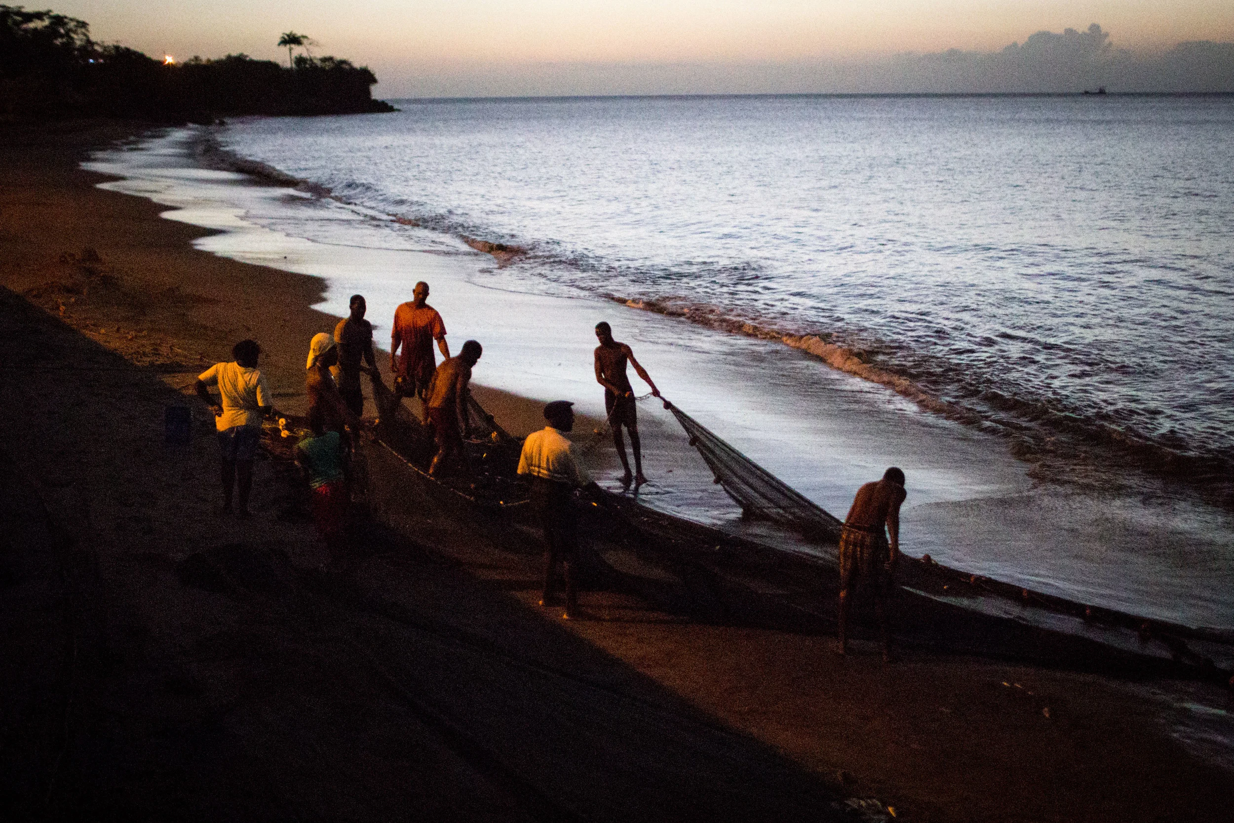 Underneath the rainbow of umbrellas at Grenada’s Saturday market, women and men softly chatted as they hand-shelled pigeon peas into plastic bags, occasionally taking a break to coax me into buying their baby purple peppers, stalks of bananas, or clusters of nutmeg and mace and jeera (aka cumin). On the coast of Grenada at dusk, I walked past a group of twenty or more villagers as they pulled in the heavy-laden nets full of jacks fish. Their ages ranged from little kids who helped collect the squirming fish into buckets to older men and women who negotiated the communal task of pulling the rest of the net on to shore before night fell. The deal was, you help, you take home fish.