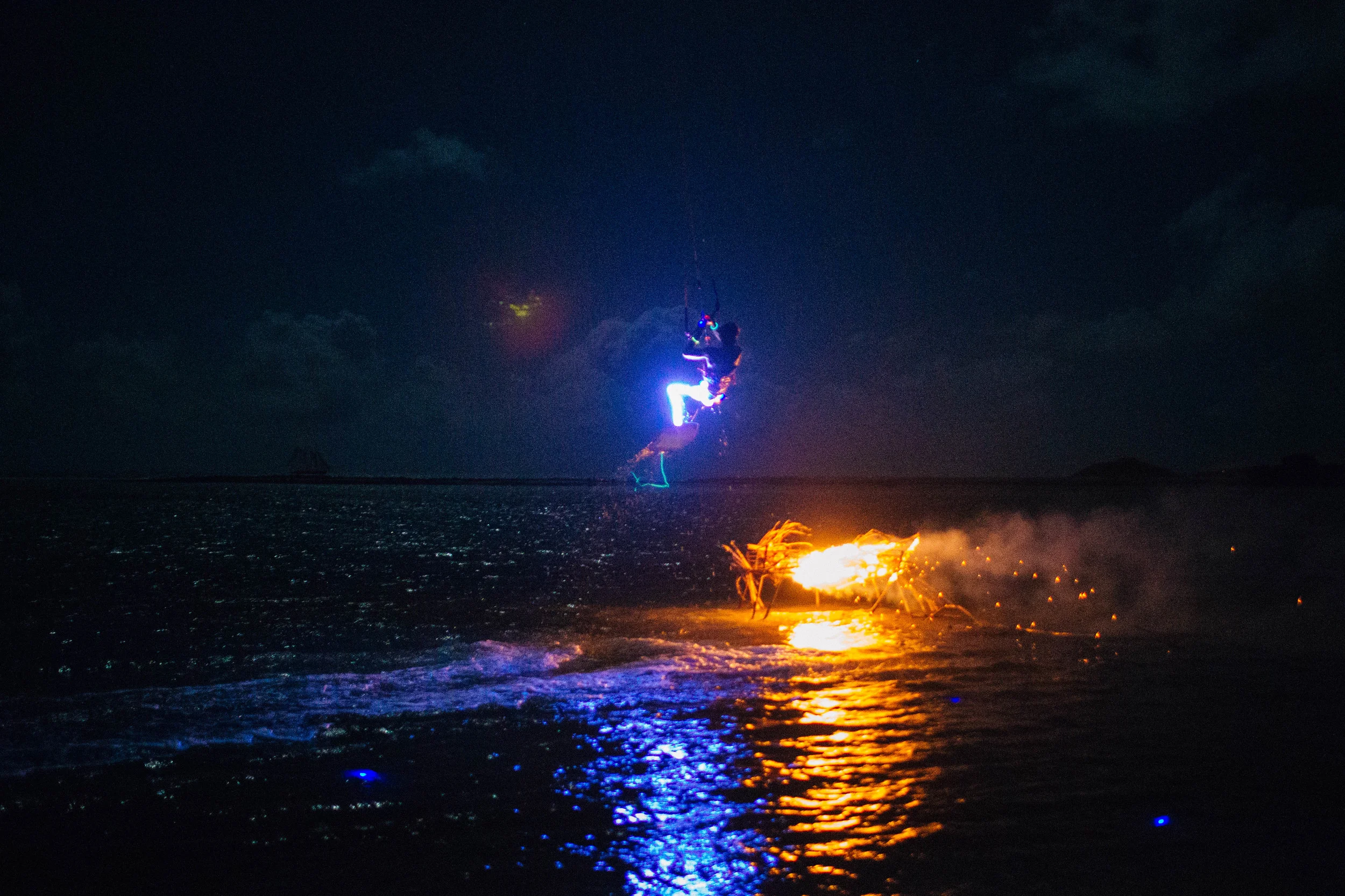 Our week was framed by the full moon. To celebrate, we congregated on the windward side of Union Island, where Jeremie Tronet, the pro-kiteboarder most famous for his “Jesus walk” trick, was hosting a full moon party complete with barbequed Lambie (the meat of the marine mollusk found in a conch shell) and rum. Dressed in black with lights running through his kite and down around his legs, Jeremie walked into the water towards a large metal basin that hovered above the saltwater flats, filled with a tower of dried palm fronds. Invisible in the darkness were the four thin nylon threads that connected him to his kite, which wafted directly above him like a patient hawk above its prey. At once, he lit a spark and the fronds erupted into a 15-foot flame. With it he sped away from the statue into a dark waters beyond. Silhouetted by the spotlight of the full moon, gaining speed, he leapt over the flame, turning the energy of the wind into an artistic performance. He waltzed with his kite over and around the flame, to and from the waters edge to a beach of growing onlookers. Once the fire had nestled into the ocean, our crew of eager kiteboarders—like giddy schoolchildren at the last bell—flocked to the water, their boards in hand and tethered to their kites like wings ready for flight. One-by-one, they tilted their kites downwind, on a race through the moonlight highway.