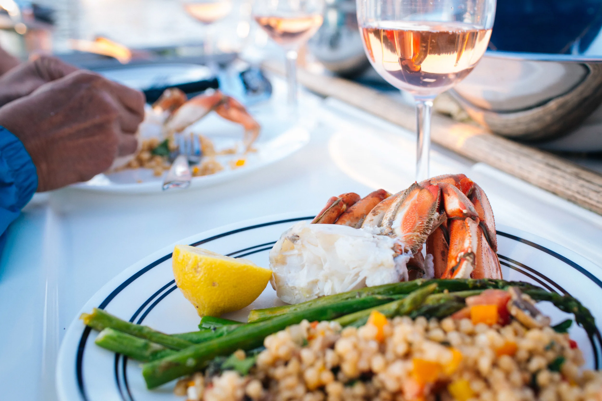 The flip-up table on the aft deck became the centerpiece of our trip, where we spent much of our time congregated around our outdoor dining room. In the warmer rose-blushed evenings, we gathered around a feast of local spot prawns cooked in garlic and white wine that previously had journeyed with us, alive, in a bucket tied to the swim platform as we sailed from Friday Harbor. In the cooler afternoons, the table hosted rounds of Bananagrams with flights of different beers, wines, and ciders made locally in Washington State. It hosted broken off chunks of tender white Dungeness crab cooked in ocean water that Paul’s father had caught for us that morning, from a specific drop location off one of the fingers of Sucia’s Echo Bay where we had anchored. The table hosted whole coral-colored Sockeye salmon flaked from a cedar plank covered in summer leeks. It hosted the leftover droplets of truffle oil drizzled on heirloom tomatoes in all their multicolored brilliance.